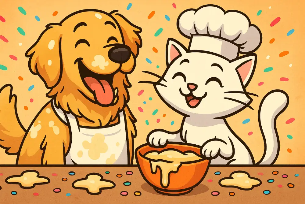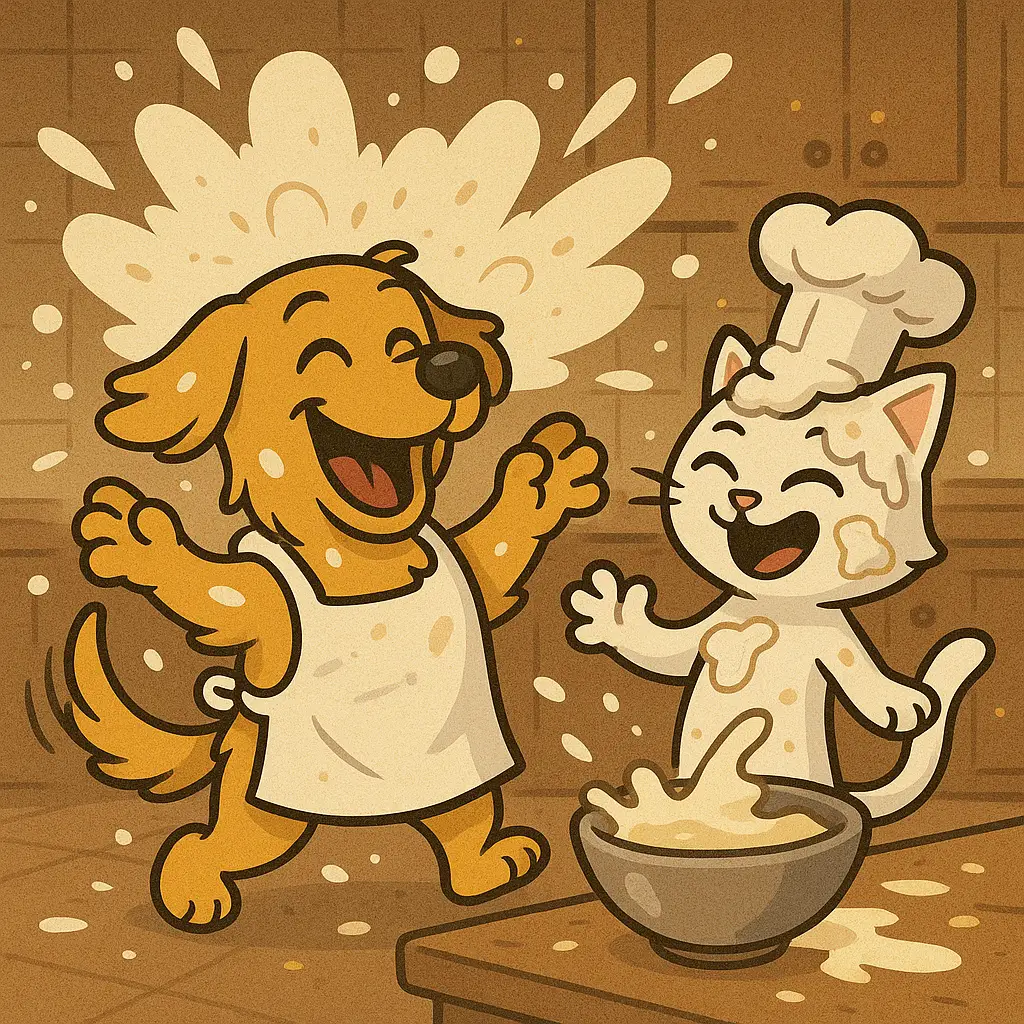 Coco sputtered, her whiskers covered in frosting. “Benny! I look like a powdered donut!” Benny laughed so hard his tail wagged into a bowl of batter, splash!