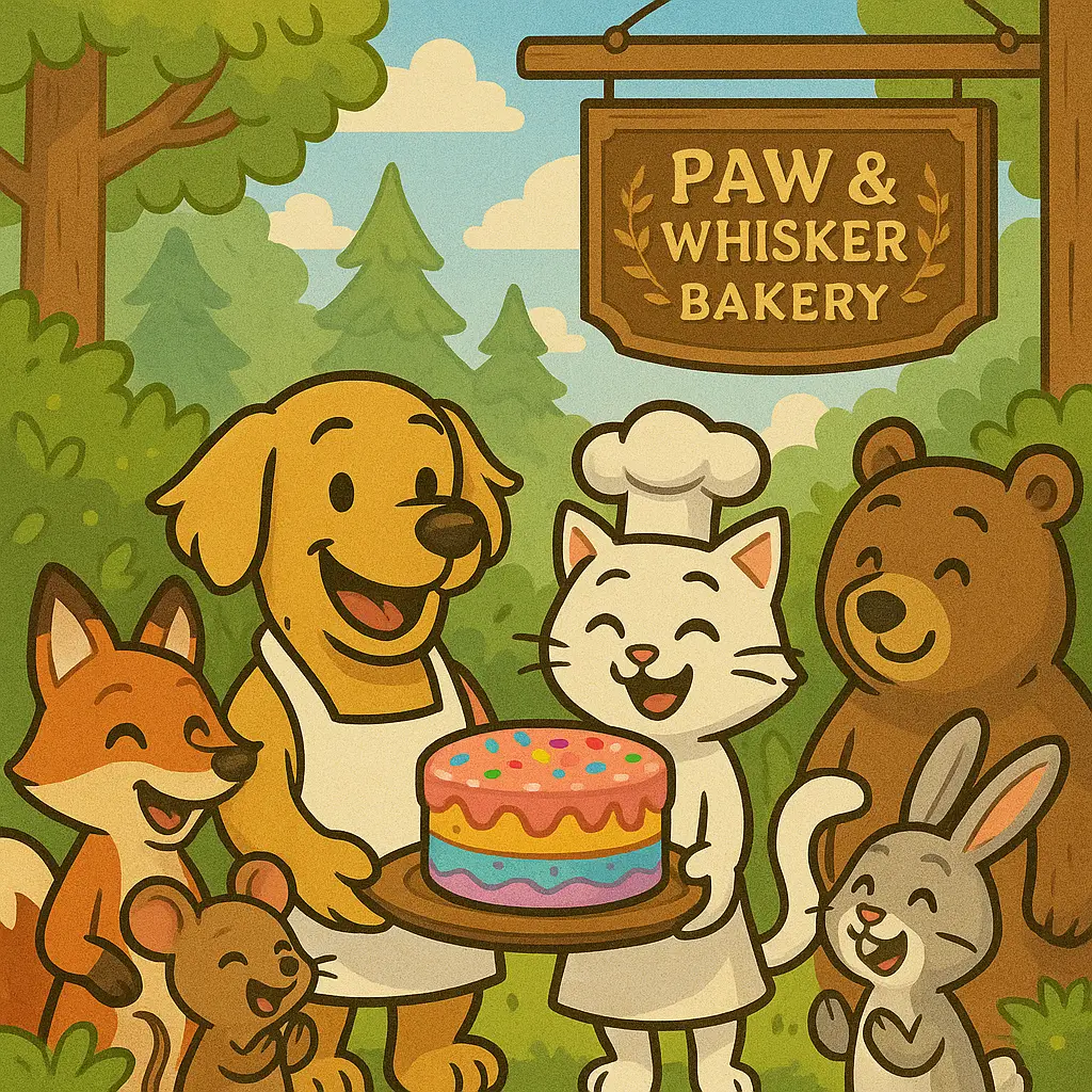 From that day on, Benny and Coco opened the “Paw & Whisker Bakery,” where no one cared who mixed or measured, as long as laughter and friendship were always on the menu.