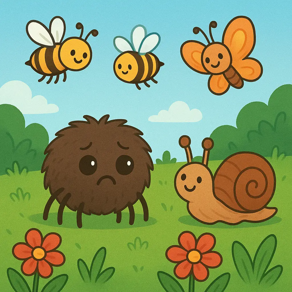 “Eeeek! A SPIDER!” shouted the bees whenever she said hello. “Shoo! Go away!” buzzed the butterflies.
