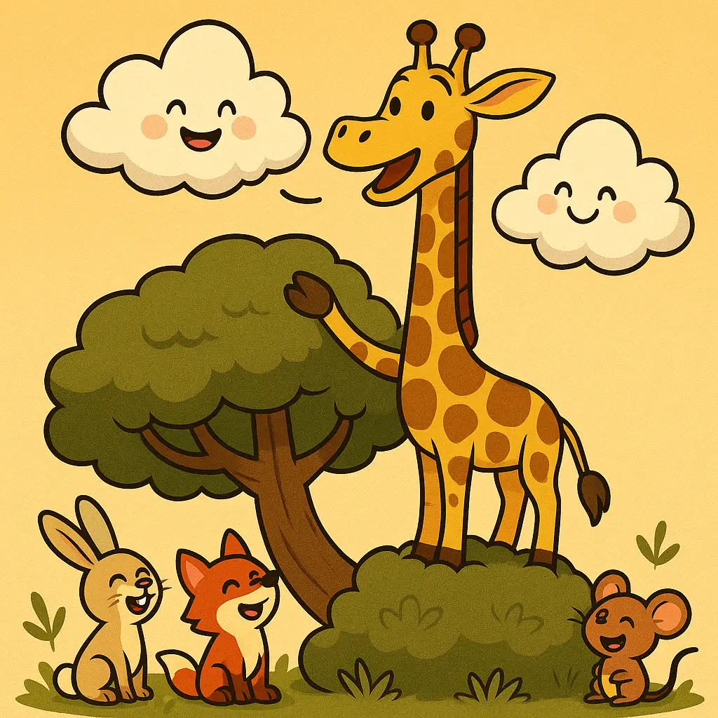 In the sunny grasslands of Savannah Park lived Gigi the Giraffe, the tallest and kindest animal around.