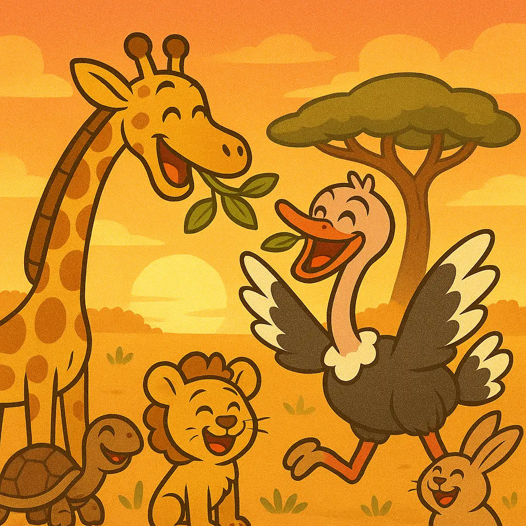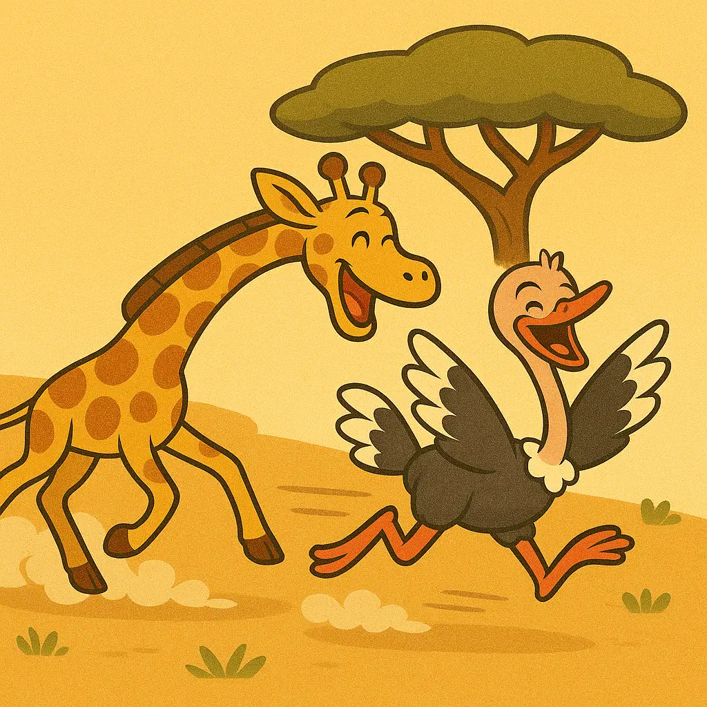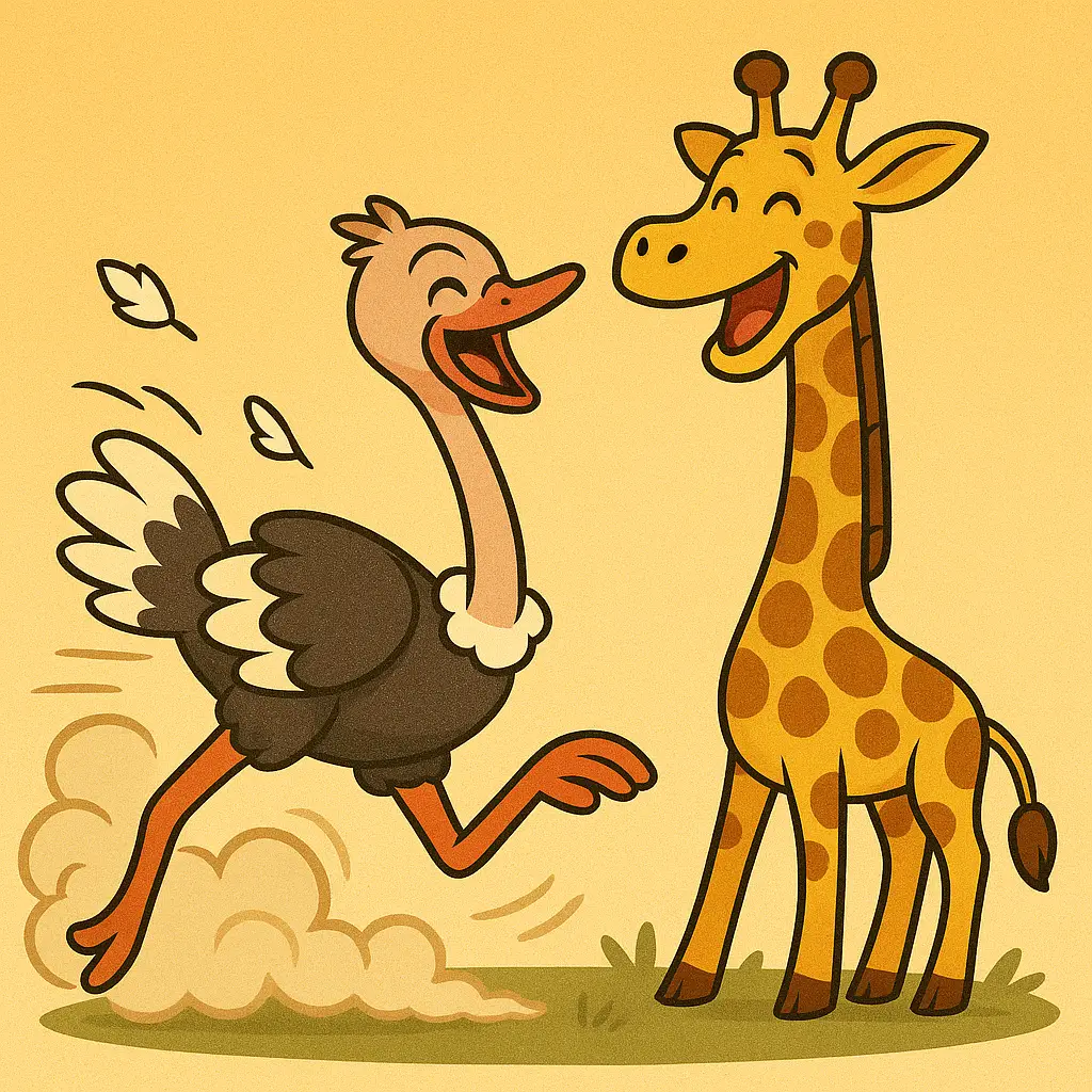 “Sorry about that! Name’s Olive the Ostrich—fastest legs this side of the desert!”