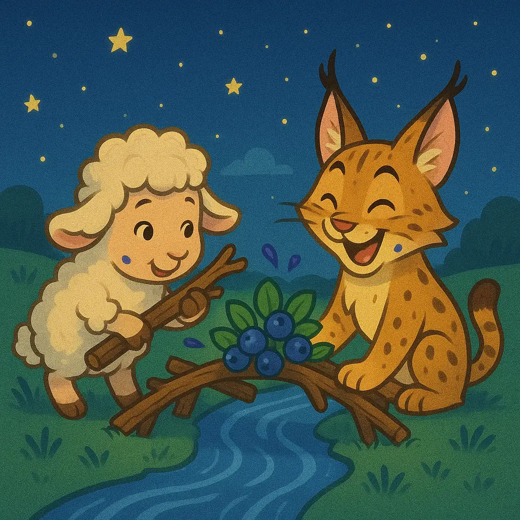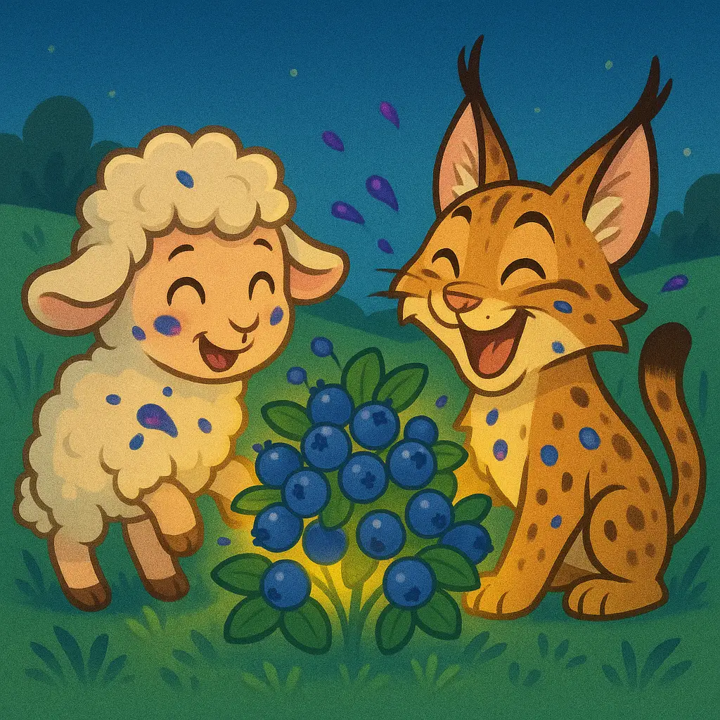 The two friends burst out laughing. “We found the magical berry bush!” said Lynx. “And teamwork!” added Lamb.