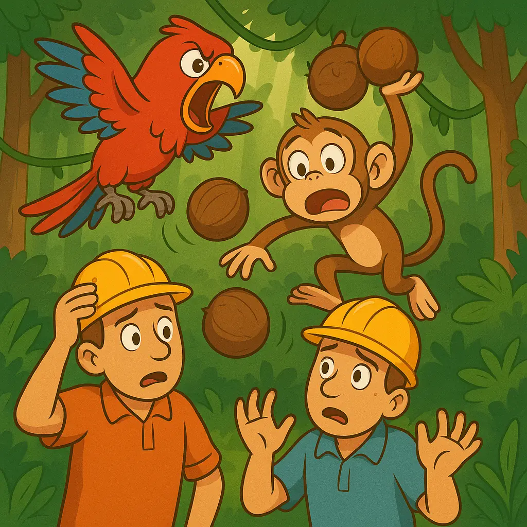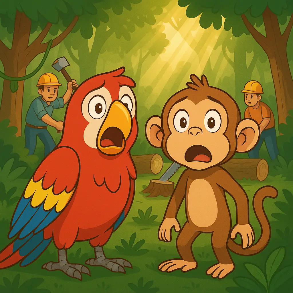 Humans were chopping down trees! Milo frowned. “They can’t take our trees! That’s our playground, our shade, and my banana stash!” Polly squawked. “We’ve got to stop them!”