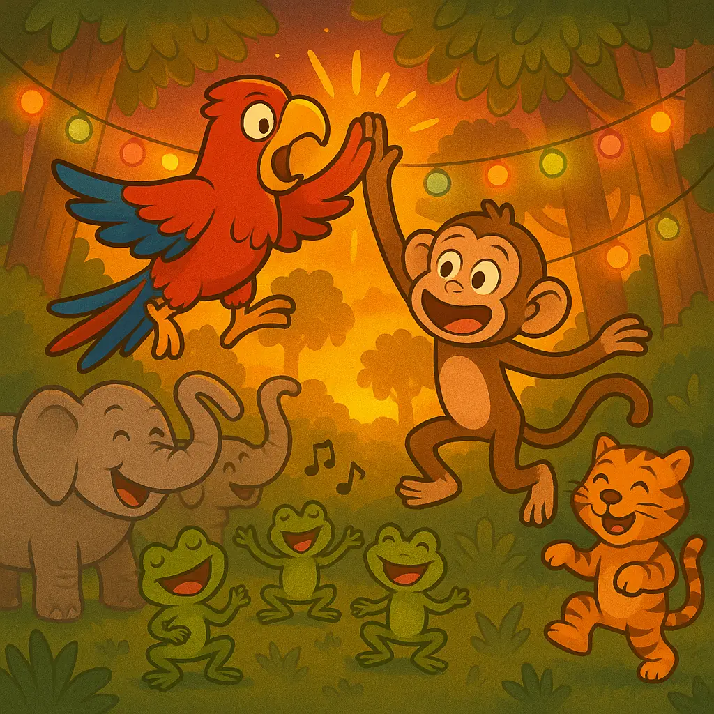 Deep in the heart of the Laughing Jungle, where vines dangled like swings and waterfalls sang lullabies, lived Milo the Monkey and Polly the Parrot; the silliest pair in the canopy.