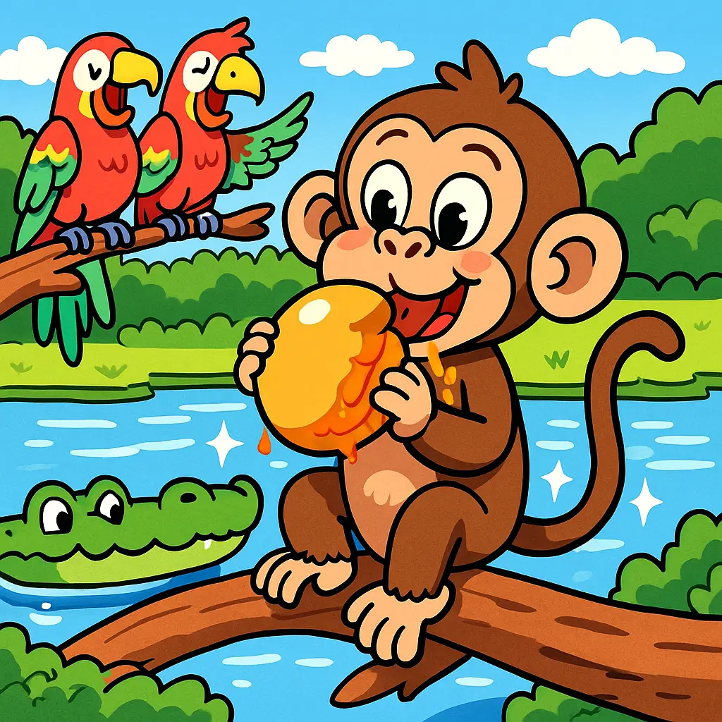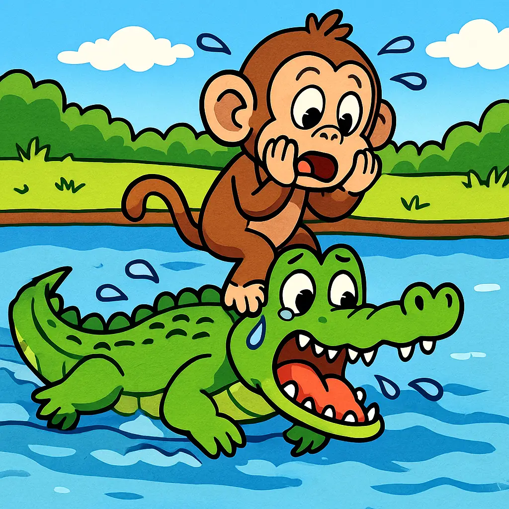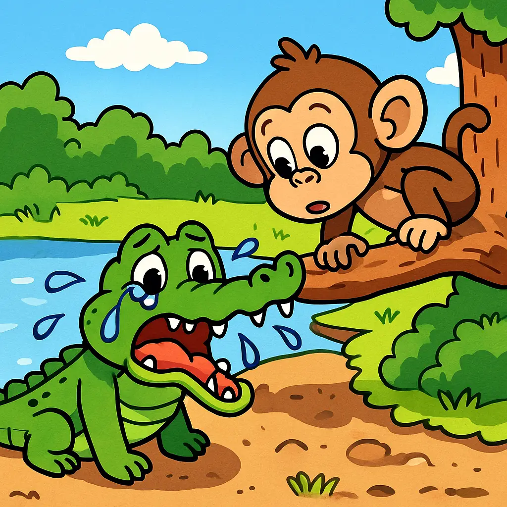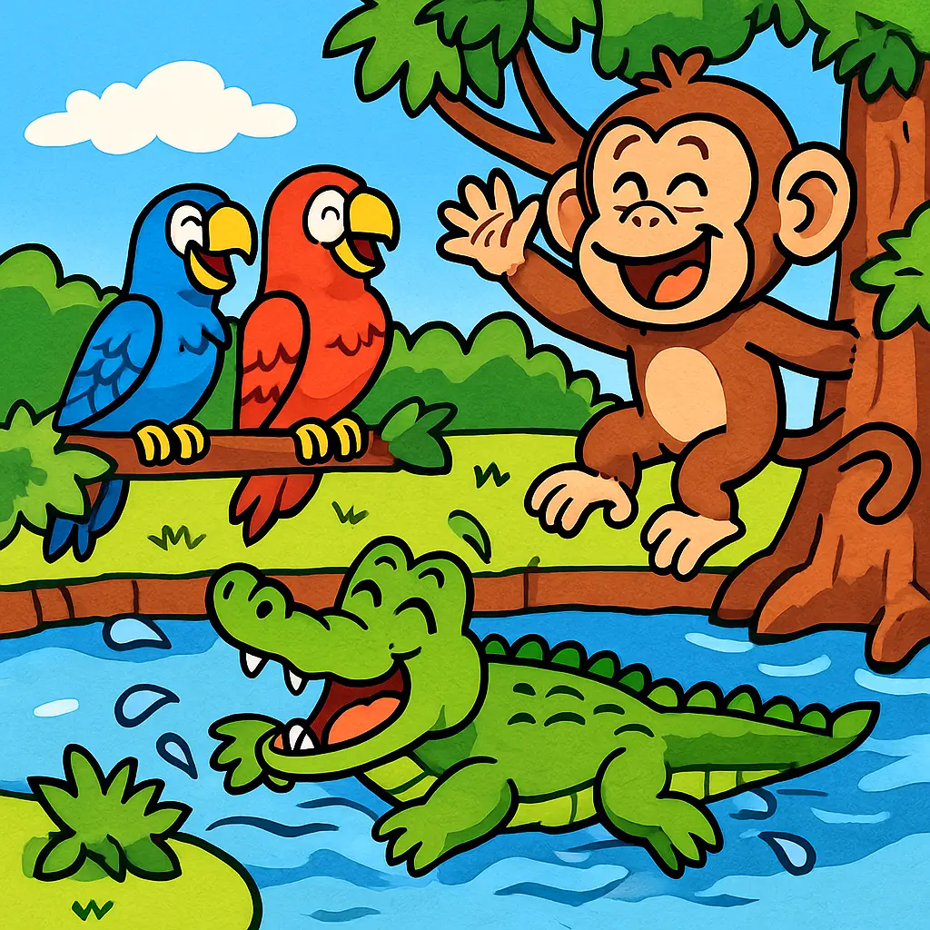 “Good morning, Monkey! I’m Carl the Crocodile,” said a toothy grin from the water. “Would you like to come closer for a chat?”
