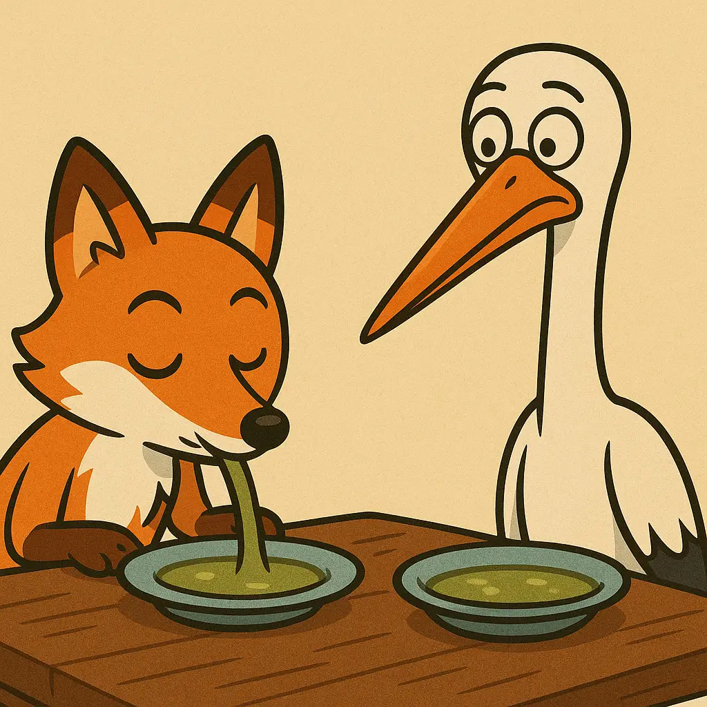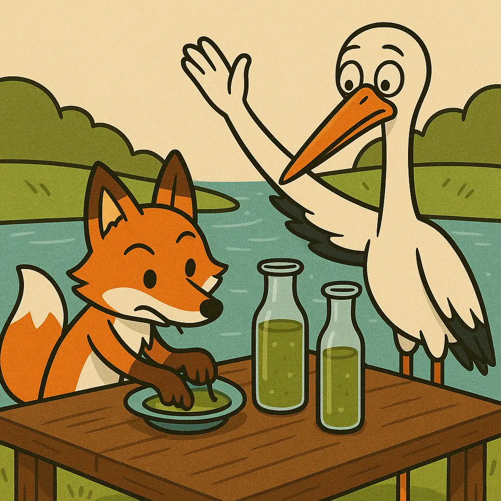 But Stella served the stew in tall, narrow jars, perfect for her long beak, but impossible for Freddy’s short snout!