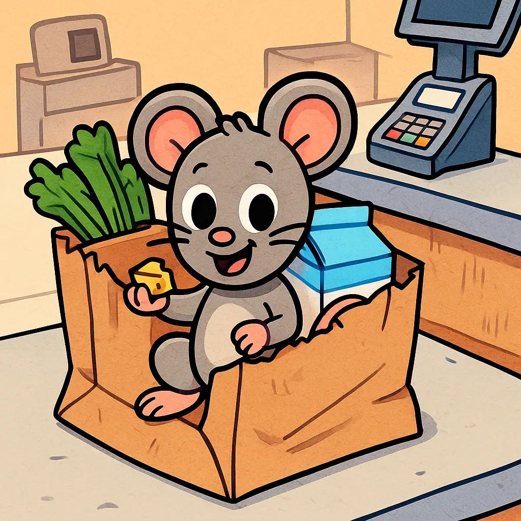 Just as the manager turned his back, Milo leapt into a bag filled with groceries, and this time, he stayed perfectly still.