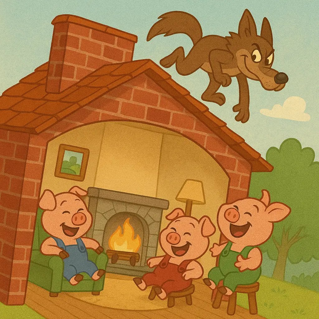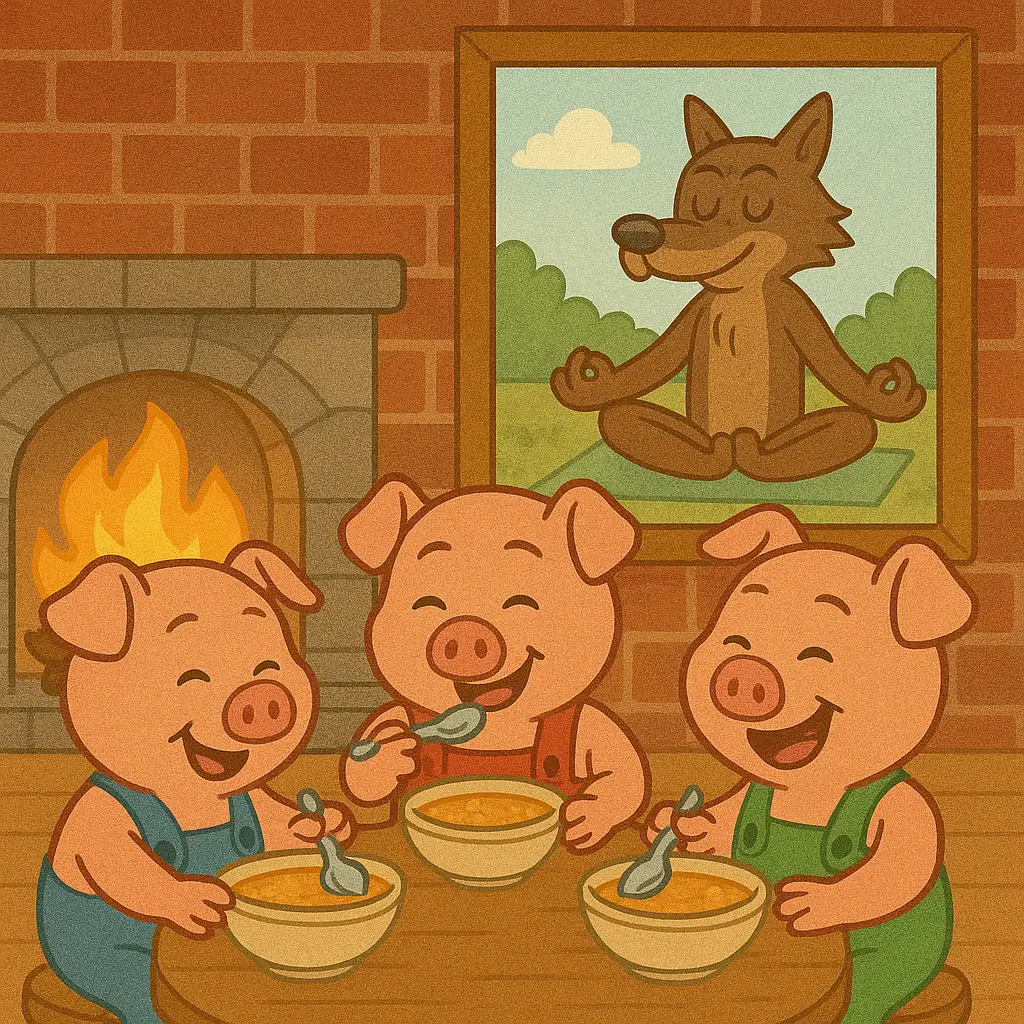 The wolf, desperate, climbed the chimney. But Puff whispered, “Let’s heat some soup!”
