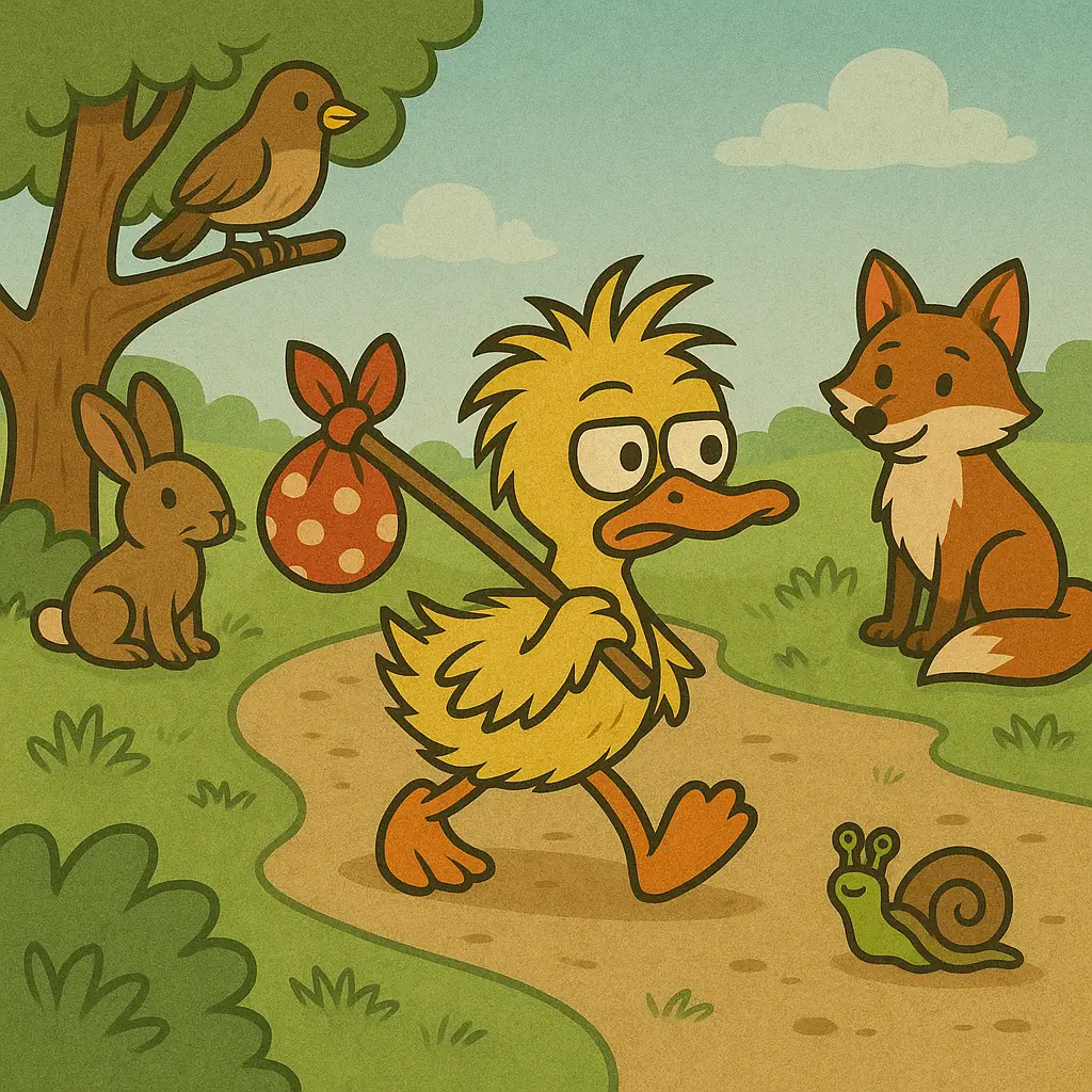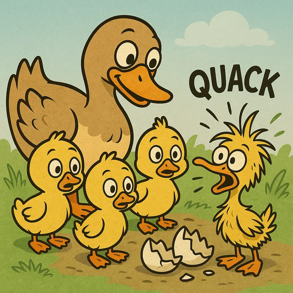 But then came the seventh egg. It was bigger, wobblier, and when it finally cracked, out came… a long-necked, funny-looking duckling with scruffy feathers and an awkward “QUONK!” instead of a “quack.”