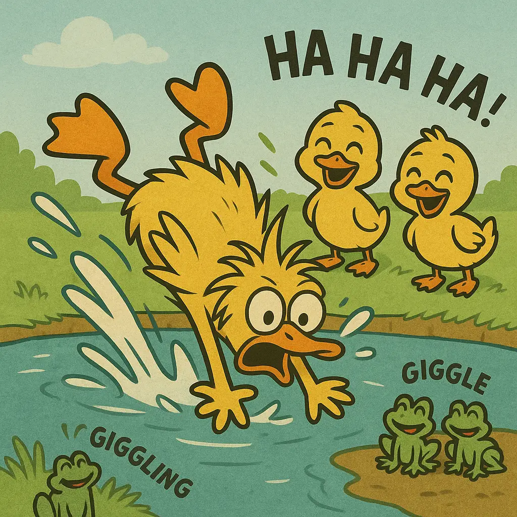 Even the frogs laughed from the lily pads. “Hey, feather-flop! Need swimming lessons?”