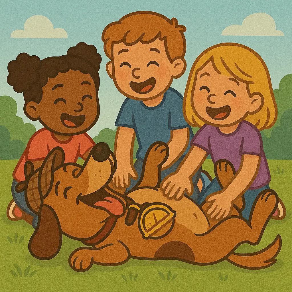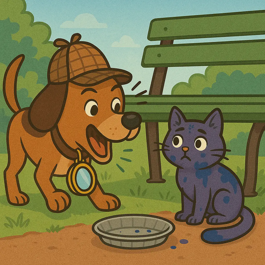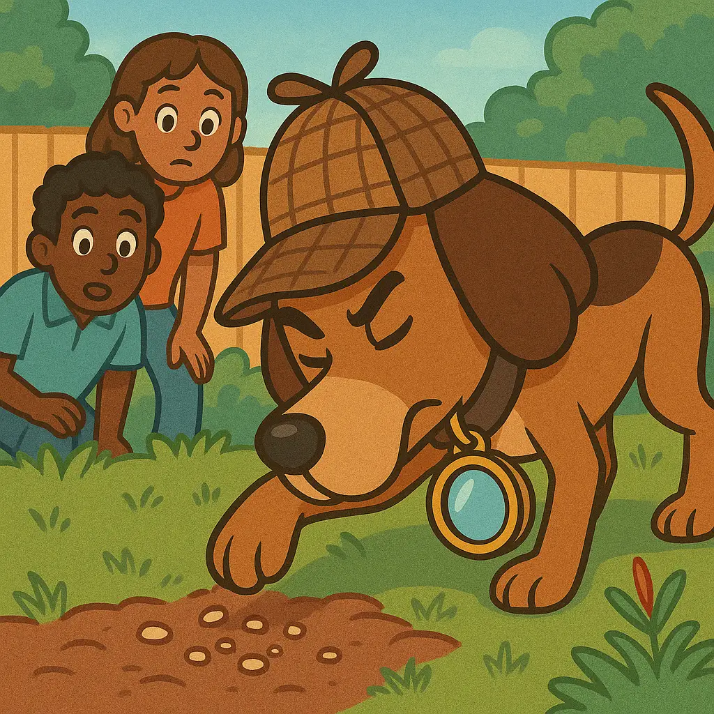 With his detective badge (a shiny dog tag) glinting in the sun, Sherlock Bones wagged happily. Another mystery solved, another nap well-earned.