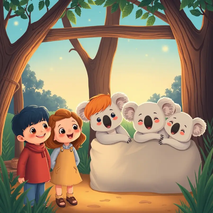 Near the edge of the forest, the kids found their first koala. It was clinging to a low tree, coughing softly.