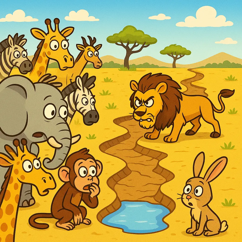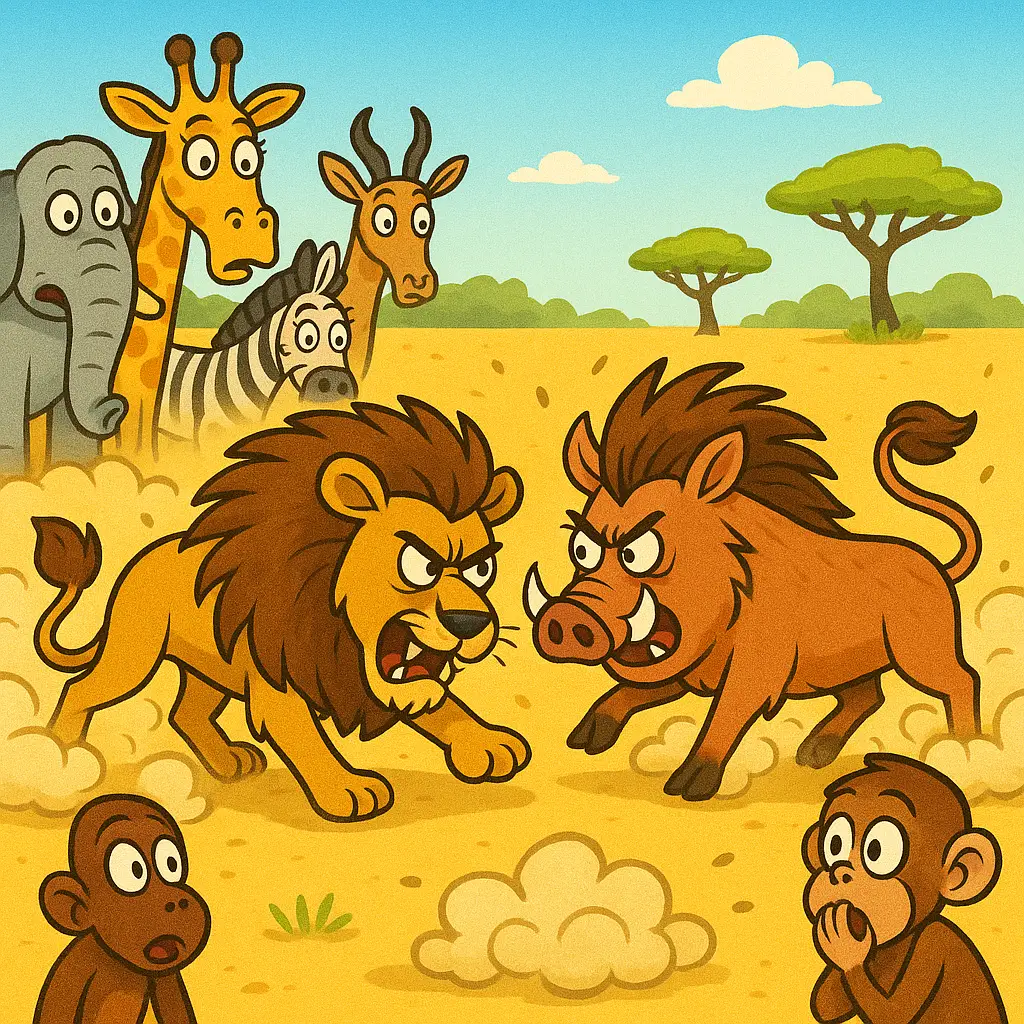 One hot afternoon in the savannah, the animals were searching for water. The river was almost dry, and only a tiny pool of water remained. Just as the animals sighed with relief, two big figures appeared, Leo the lion and Bruno the boar.