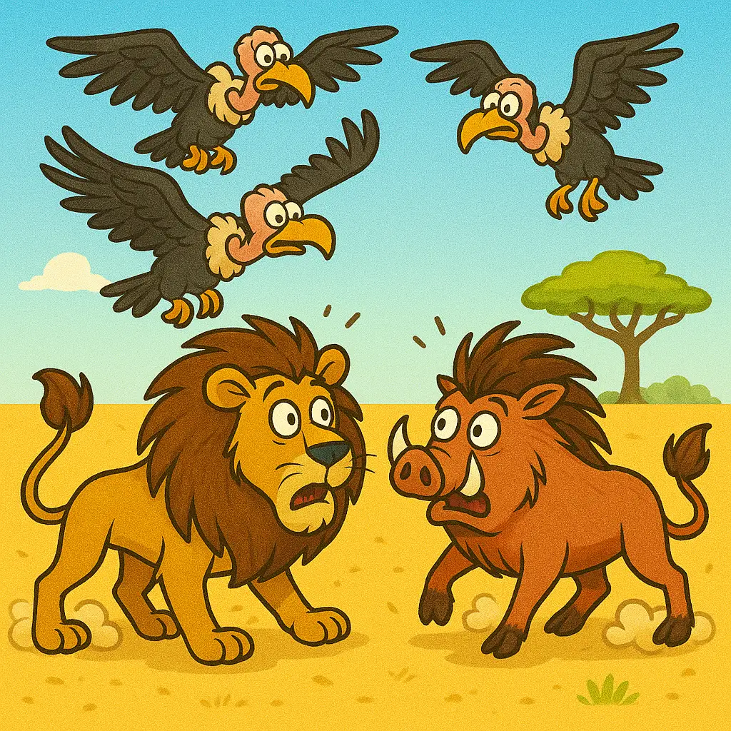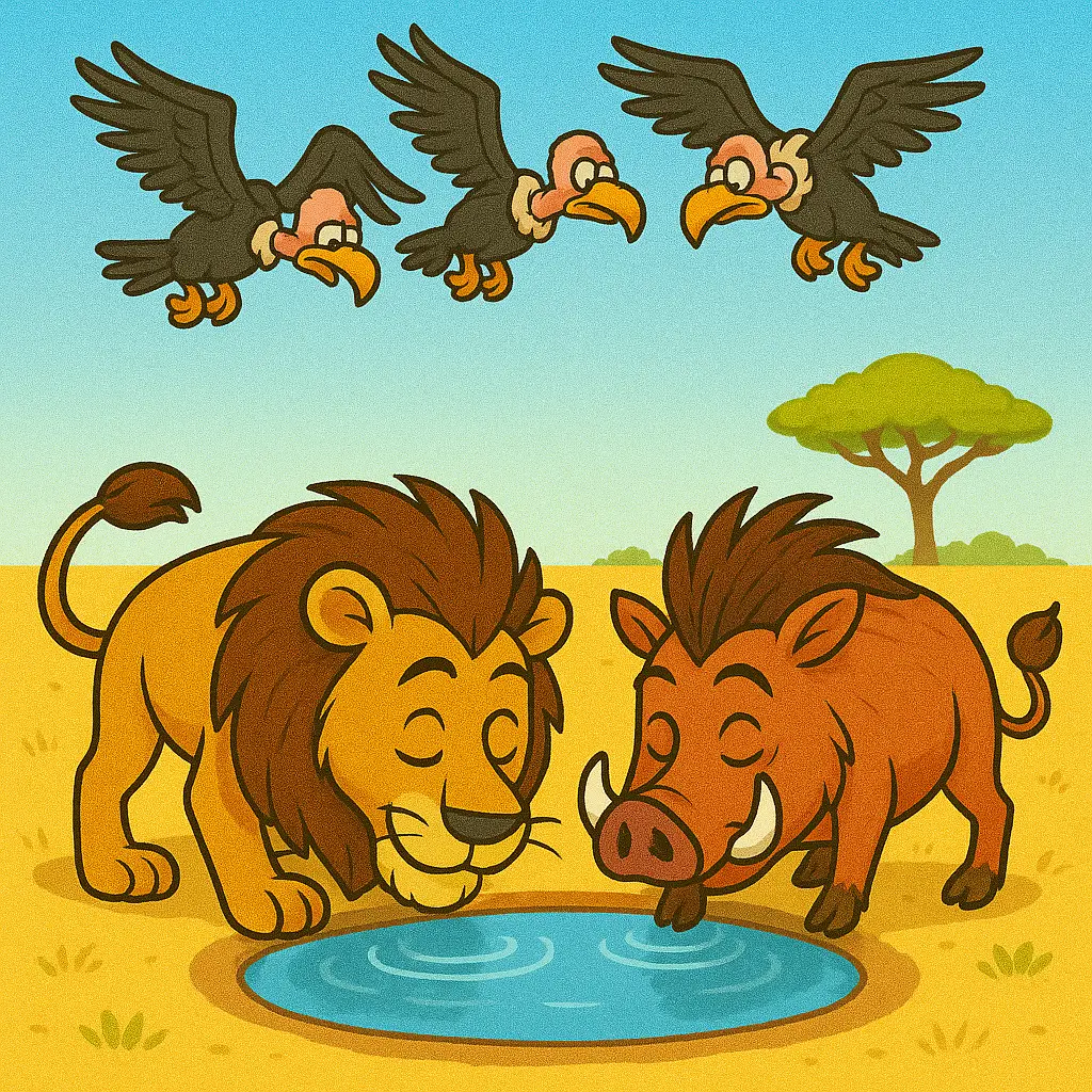 Leo and Bruno froze mid-fight. They peeked up at the vultures, licking their beaks. Suddenly, the water didn’t seem like the biggest problem anymore.