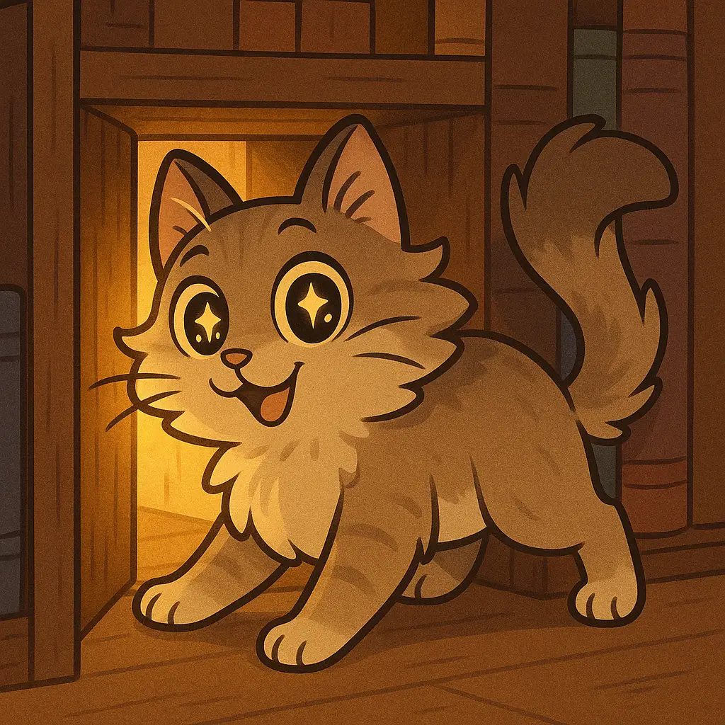 One rainy afternoon, as he pawed at a bookshelf, his whiskers twitched. Tap! Tap! A hidden door swung open behind the books.
