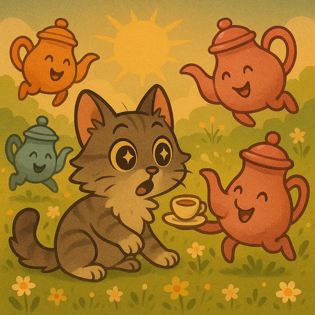 The teapots all giggled and rolled around, spilling tea everywhere. Whiskers slipped, landed in a puddle, and meowed, “Well, that’s one way to take a bath!”