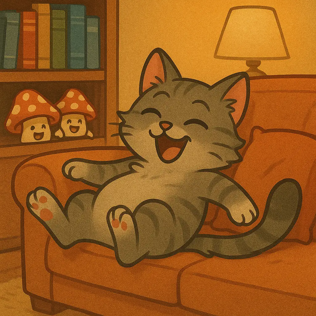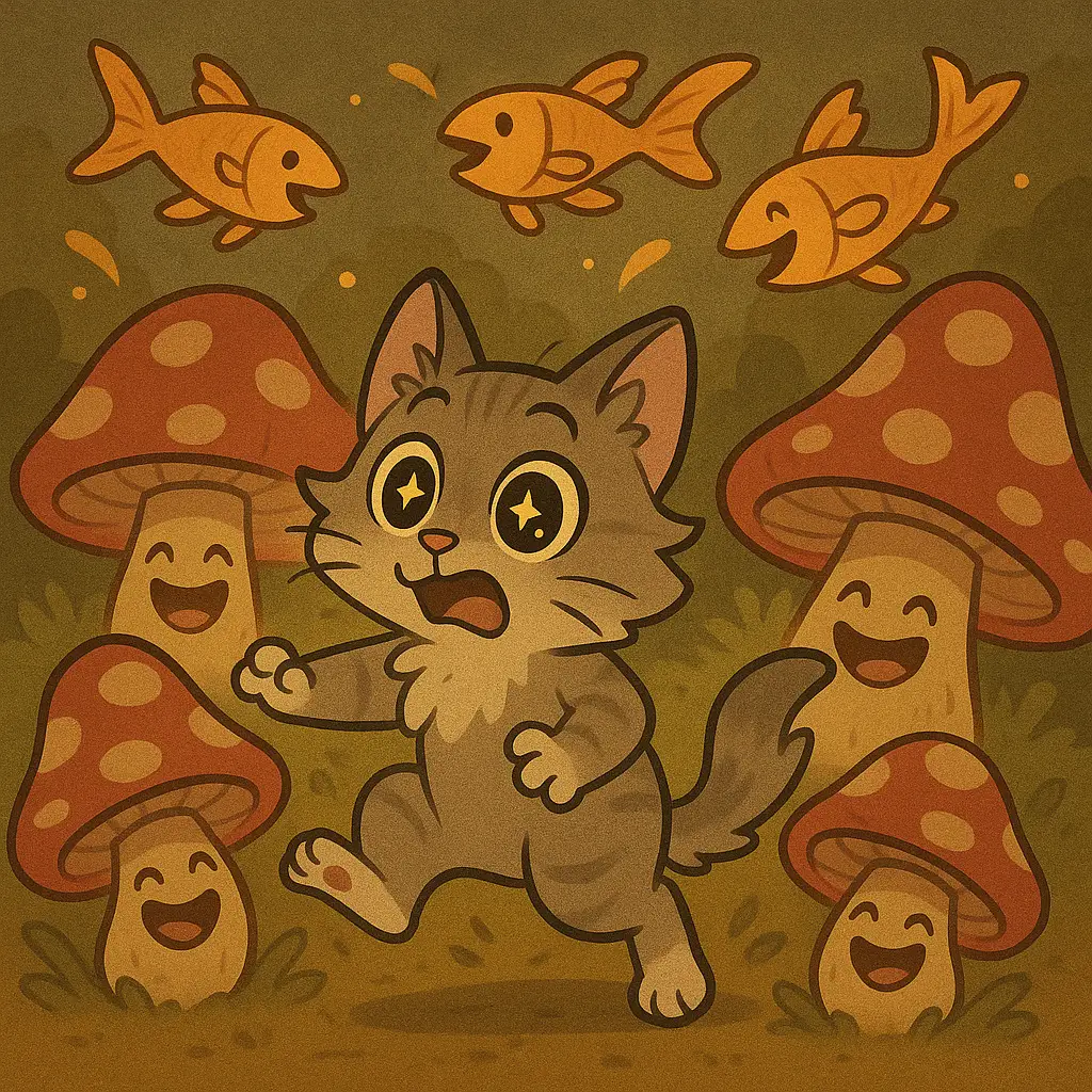 He shook his fur, curled up on the sofa, and thought, “No one will believe me about flying fish and laughing mushrooms.”