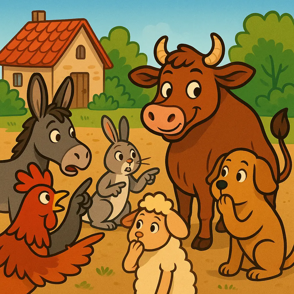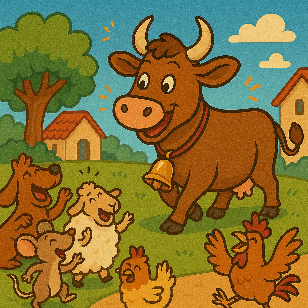 In the quiet village of Sunnyfields lived Daisy the cow, who loved sneaking into gardens at night. She munched on fresh cabbage, licked the tomatoes, and even nibbled Mrs. Maple’s laundry! The animals were tired of her late-night tricks, but no one dared stop her. Daisy was big, gentle, but sneaky.