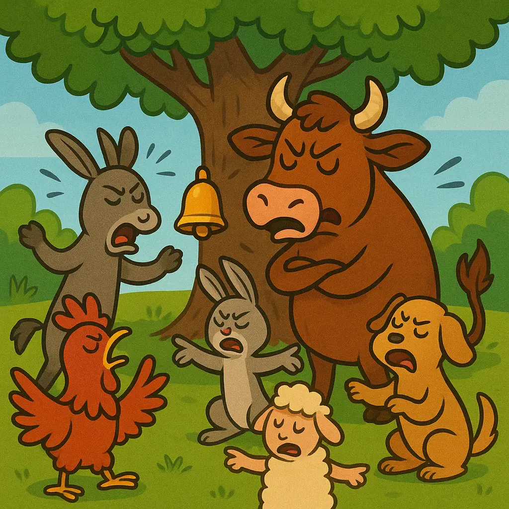 The meeting turned into a hilarious debate. Each animal imagined themselves tiptoeing up to Daisy with the shiny bell, only to be chased, mooed at, or splashed with mud.